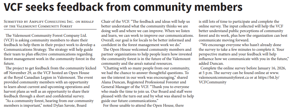 The Valemount Community Forest Company Ltd.(VCF) was established in 2007. The VCF has a commitment to manage a healthy, sustainable forest with a focus on local employment, education, partnerships and multiuse planning. We support and promote small and value-added manufacturing to increase economic stability and industrial diversity. We also work with recreational groups and conservation interests to reflect the values important to the community of Valemount. The VCF is member of the British Columbia Community Forest Association. The BCCFA was formed in 2002. It networks community-based organizations that are either managing community forests or striving to establish community forests. In her op-ed “Community Forests: Rooted in Community, Growing for Generations,” Jennifer Gunter, Executive Director of the BC Community Forest Association, highlights community forests as a powerful model for sustainable, locally driven forest management in B.C. These forests prioritize public benefit over private profit, supporting ecosystem health, wildfire mitigation, and community resilience while navigating complex challenges like fibre scarcity and economic pressures. With 62 diverse community forests across the province — many involving Indigenous leadership — Gunter emphasizes the need for supportive provincial policies, stronger collaboration between stakeholders, and a balanced approach that reflects local values. Rather than seeing recent tensions as failures, she calls for dialogue and innovation to help community forests reach their full potential in shaping a resilient, value-added forest economy. British Columbia Community Forest Association article, published in Canadian Forest Industries Magazine, link below: As Published in Canadian Forest Industries Magazine, Pulp & Paper Magazine and Canadian Biomass Magazine – British Columbia Community Forest Association